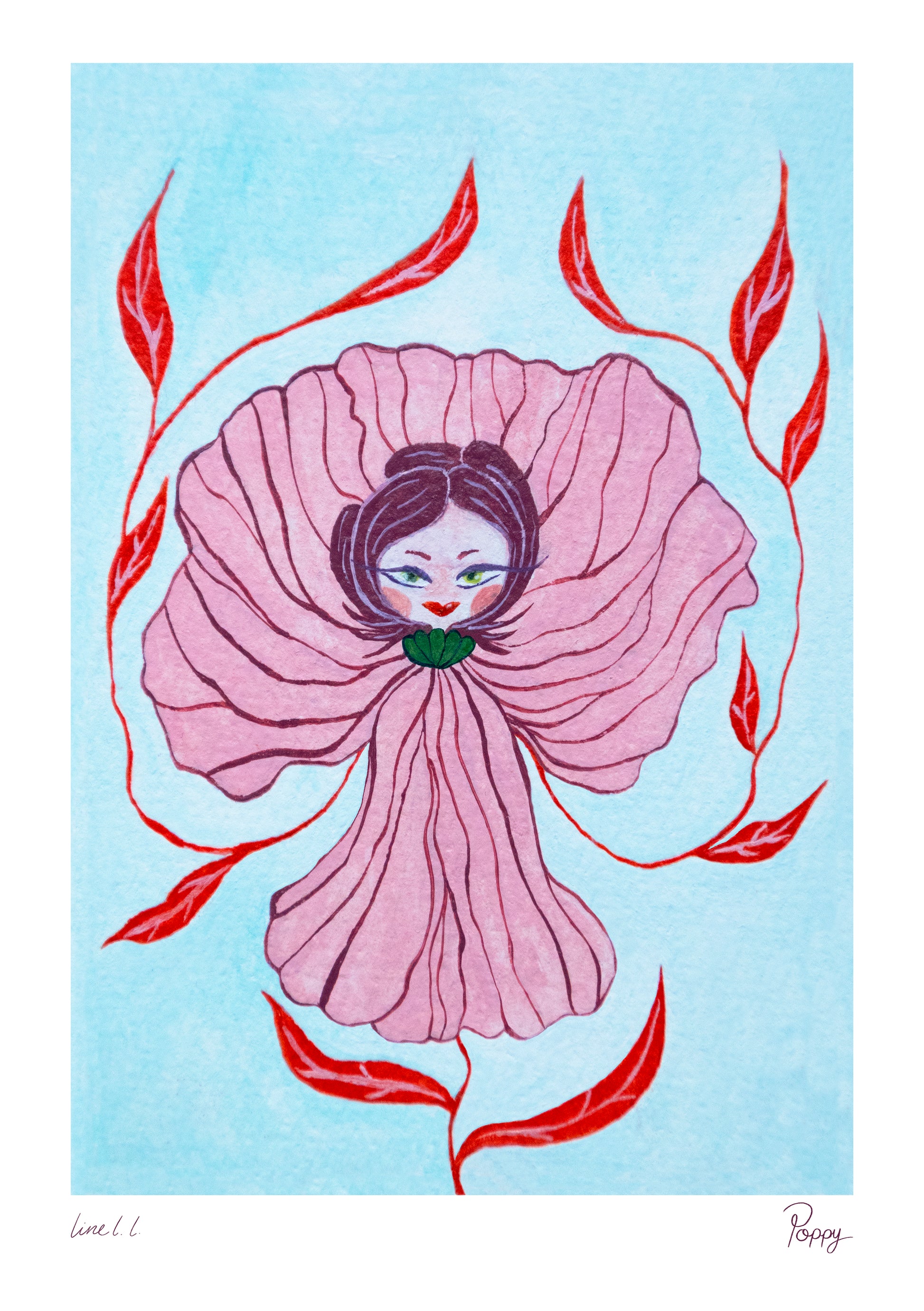 Poppy is the second work in the Flower Child series, hand-painted in gouache. The painting continues the series’ exploration of flowers that take on figure-like presence.